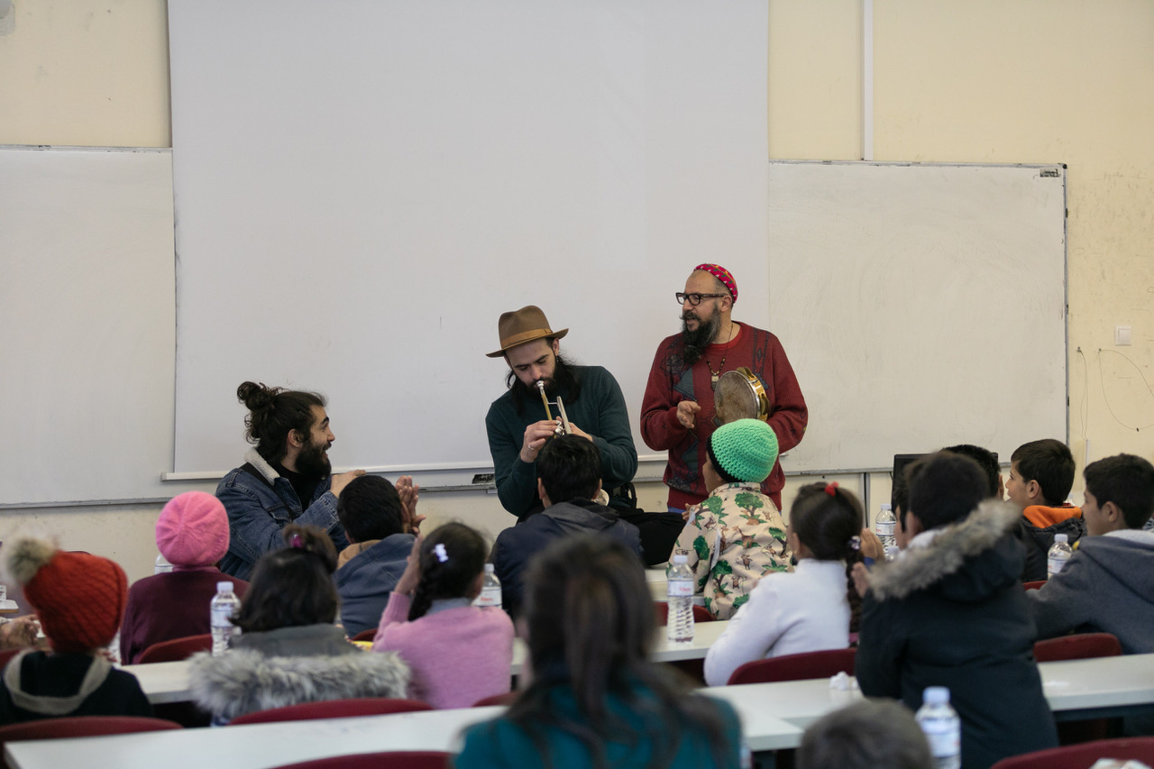 On Thursday, 6th of February, in the Greek island of Chios, four musicians from the SoundRoutes program performed at the Homerion Cultural Centre of the Municipality of Chios in front of an audience of approximately 400 people. Trumpetist Milad Khawam, singer G H A Y S and percussionist Salam Al Hassan from Syria and guitarist Ahmad Hani from Egypt, performed a show for Chios Music Festival, combining Syrian folk songs and Khawam’s music from his latest album. It was a night to remember, as in their final act they were joined by the students of the Chios Music School and the Philharmonic Orchestra of Chios, where they performed together, showing that music has no boundaries and it is the common language amongst ethnicities. Before the concert Milad, G H A Y S, Salam and Ahmad gave a masterful workshop at the Chios Music School. They also met with refugee children from the camp of Chios, at the Aegean University. They offered them an hour and a half full of music, laughs and carefree discussions.
